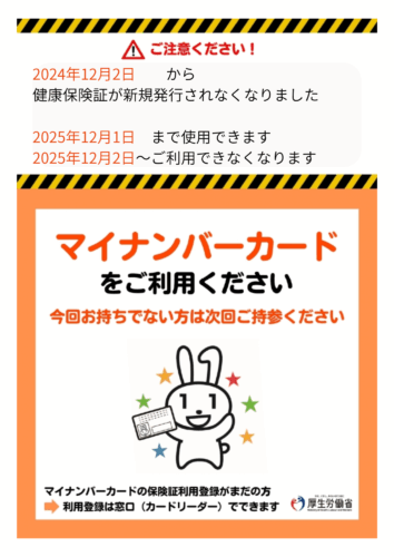 従来の健康保険証は2025年12月1日期限をむかえ、12月2日以降は「マイナ保険証」が基本となりますので、よろしくお願いいたします。